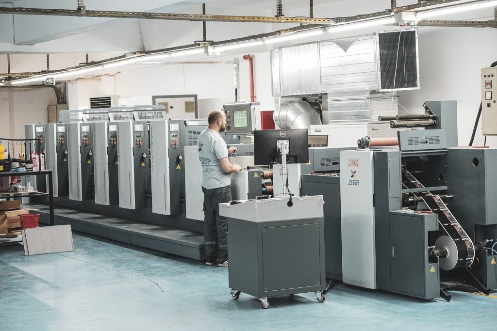Baskı makinesi, etiketlerin üzerine tasarımların veya bilgilerin basılmasını sağlar. Bu makineler genellikle ofset baskı veya flekso baskı teknolojisi kullanır. Ofset baskı, yüksek kaliteli ve hassas baskılar elde etmek için genellikle tercih edilen bir yöntemdir. Flekso baskı ise daha hızlı üretim sağlayan bir teknolojidir. Baskı makineleri, genellikle çok renkli baskı yapabilme yeteneklerine sahiptir ve farklı ebatlarda etiketlere uyum sağlayabilir.